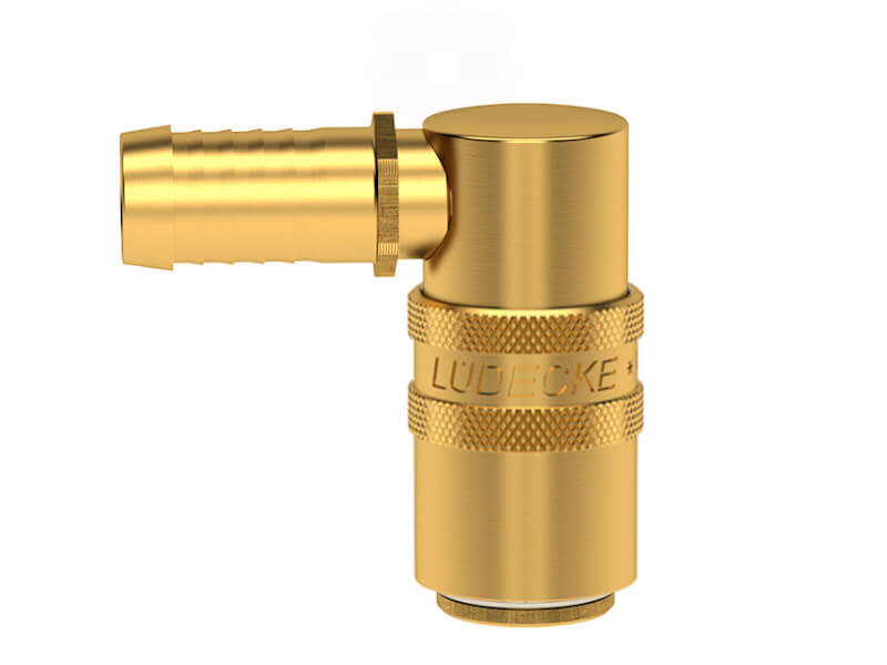 Gniazdo szybkozłączki z króćcem do węża, wykonane z mosiądzu (MS 58), z elementami ze stali szlachetnej i uszczelnieniem z gumy fluorowej (FKM).