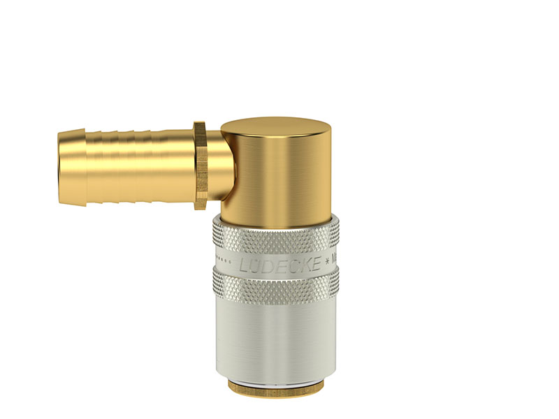 Gniazdo szybkozłączki z króćcem do węża, wykonane z mosiądzu (MS 58), z elementami ze stali szlachetnej, mosiądzu niklowanego i uszczelnieniem z gumy fluorowej (FKM).