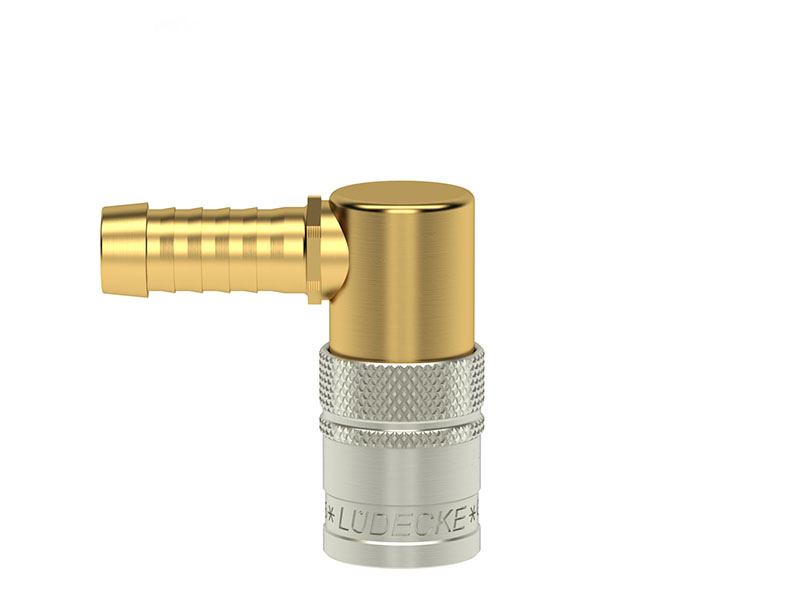 Gniazdo szybkozłączki z króćcem do węża, wykonane z mosiądzu (MS 58), z elementami ze stali szlachetnej, mosiądzu niklowanego i uszczelnieniem z gumy fluorowej (FKM).