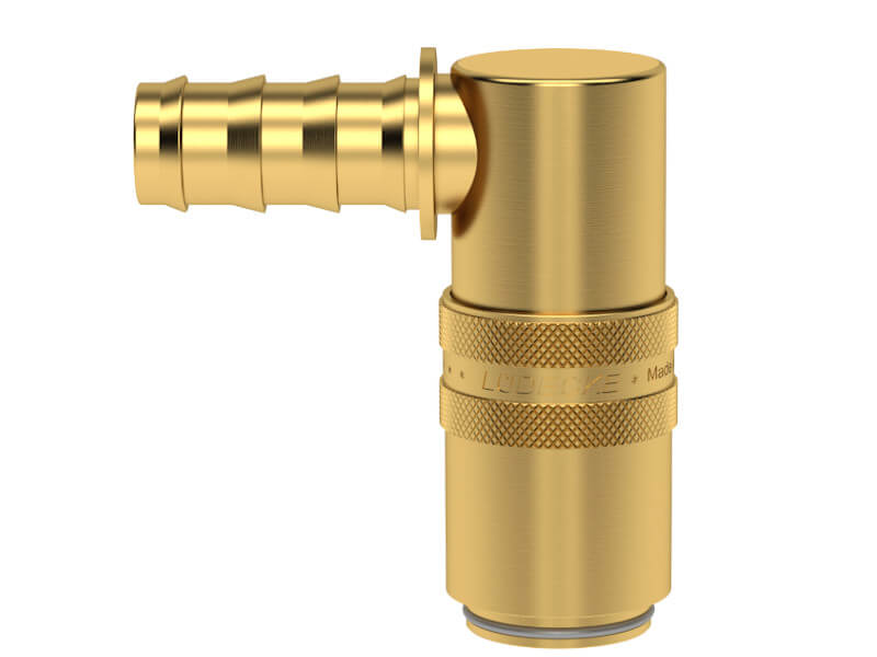 Gniazdo szybkozłączki z króćcem do węża, wykonane z mosiądzu (MS 58), z elementami ze stali szlachetnej i uszczelnieniem z gumy fluorowej (FKM).