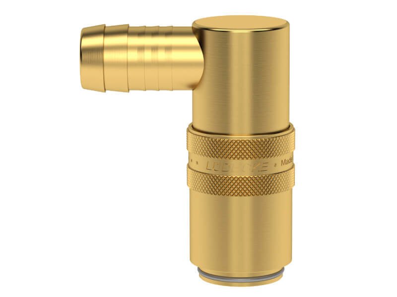 Gniazdo szybkozłączki z króćcem do węża, wykonane z mosiądzu (MS 58), z elementami ze stali szlachetnej i uszczelnieniem z gumy fluorowej (FKM).