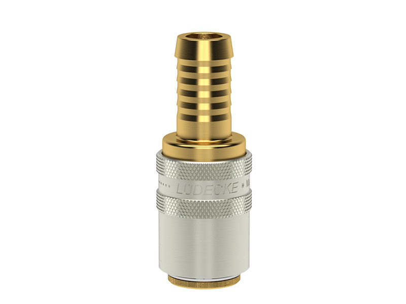 Gniazdo szybkozłączki z króćcem do węża, wykonane z mosiądzu (MS 58), z elementami ze stali szlachetnej, mosiądzu niklowanego i uszczelnieniem z gumy fluorowej (FKM).