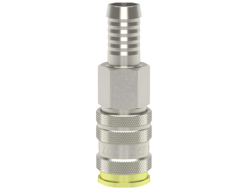 Gniazdo szybkozłączki jednostronnie odcinającej z króćcem do węża, wykonane z mosiądzu (MS 58), z elementami ze stali hartowanej,stali szlachetnej z uszczelnieniem z gumy nitrylowej (NBR).