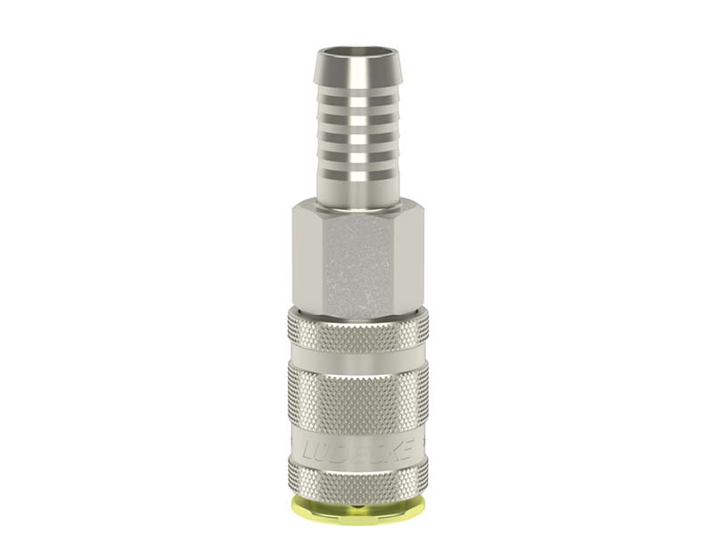 Gniazdo szybkozłączki jednostronnie odcinającej z króćcem do węża, wykonane z mosiądzu (MS 58) niklowanego, z elementami ze stali hartowanej, stali szlachetnej i uszczelnieniem z gumy nitrylowej (NBR).