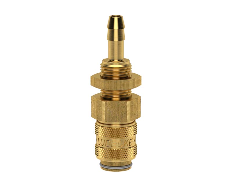 Gniazdo szybkozłącza jednostronnie odcinającego z GZ zakończonym króćcem i nakrętką kontrującą, wykonane z mosiądzu (MS 58), z elementami ze stali szlachetnej i uszczelnieniem z gumy nitrylowej (NBR).