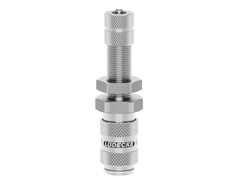 Gniazdo szybkozłączki grodziowej, obustronnie odcinającej z króćcem do wąż i nakrętką zaciskową, wykonane ze stali szlachetnej (nierdzewnej) i uszczelnieniem z Vitomu (FKM).