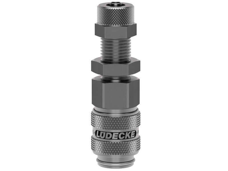 Gniazdo szybkozłączki grodziowej, obustronnie odcinającej z króćcem do wąż i nakrętką zaciskową, wykonane ze stali szlachetnej (nierdzewnej) i uszczelnieniem z Vitomu (FKM).