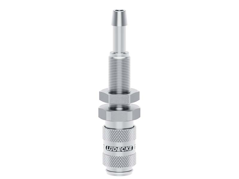 Gniazdo szybkozłącza jednostronnie odcinającego z króćcem do węża i nakrętką kontrującą, wykonane ze stali szlachetnej (nierdzewnej) i uszczelnieniem z Vitomu (FKM).