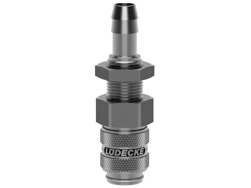 Gniazdo szybkozłącza jednostronnie odcinającego z króćcem do węża i nakrętką kontrującą, wykonane ze stali szlachetnej (nierdzewnej) i uszczelnieniem z Vitomu (FKM).