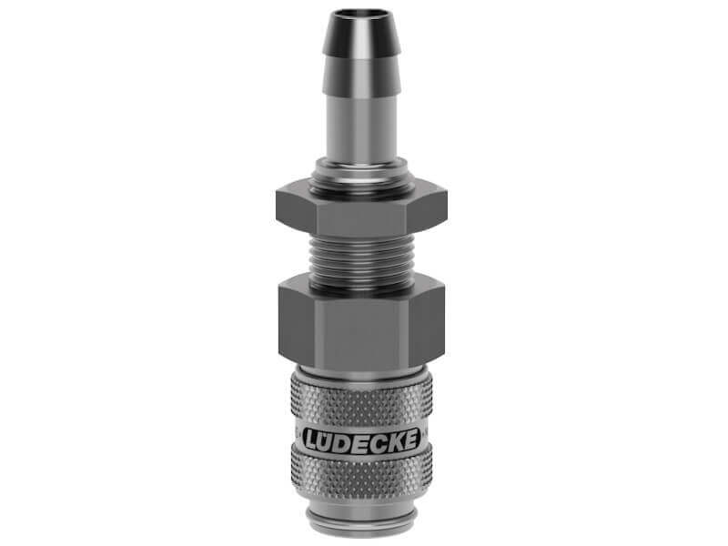 Gniazdo szybkozłącza dwustronnie odcinającego z króćcem do węża i nakrętką kontrującą wykonane ze stali szlachetnej (nierdzewnej) i uszczelnieniem z Vitomu (FKM).
