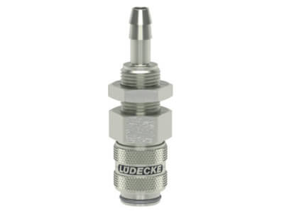 Gniazdo szybkozłącza z króćcem i nakrętką kontrującą, wykonane z mosiądzu (MS 58) niklowanego, z elementami ze stali szlachetnej i uszczelnieniem z gumy nitrylowej (NBR).