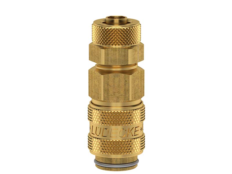 Gniazdo szybkozłącza jednostronnie odcinającego z króćcem i nakrętką zaciskową, wykonane z mosiądzu (MS 58), z elementami ze stali szlachetnej i uszczelnieniem z gumy nitrylowej (NBR).