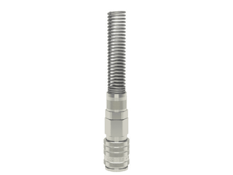Gniazdo szybkozłączki bez zaworu z króćcem do węża, nakrętką zaciskową i spiralą ochronną na wąż, wykonane z mosiądzu (MS 58) niklowanego, z elementami ze stali szlachetnej i uszczelnieniem z gumy nitrylowej (NBR).