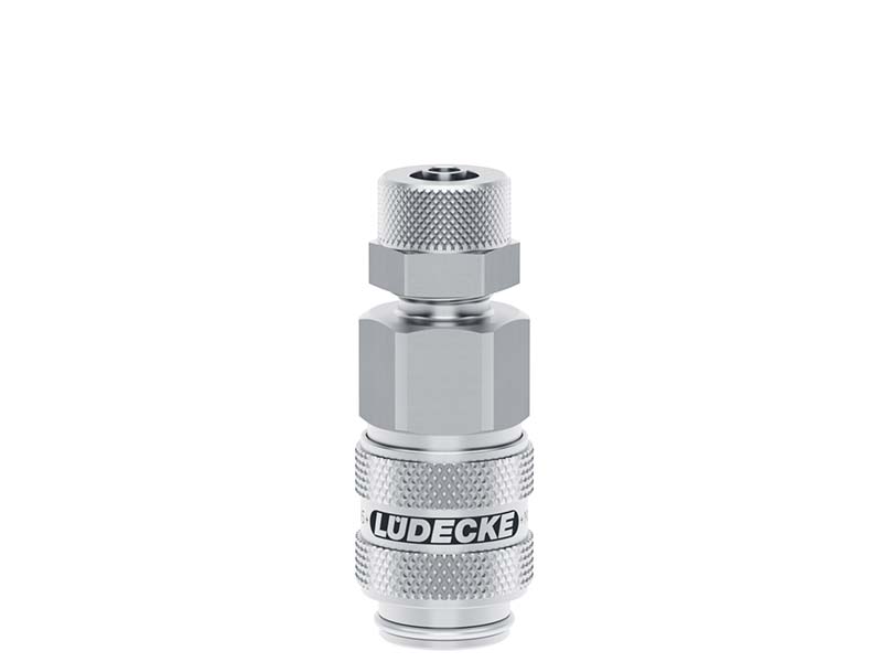 Gniazdo szybkozłącza jednostronnie odcinającego z króćcem do węża i nakrętką zaciskową, wykonane ze stali szlachetnej (nierdzewnej) i uszczelnieniem z Vitonu (FKM).