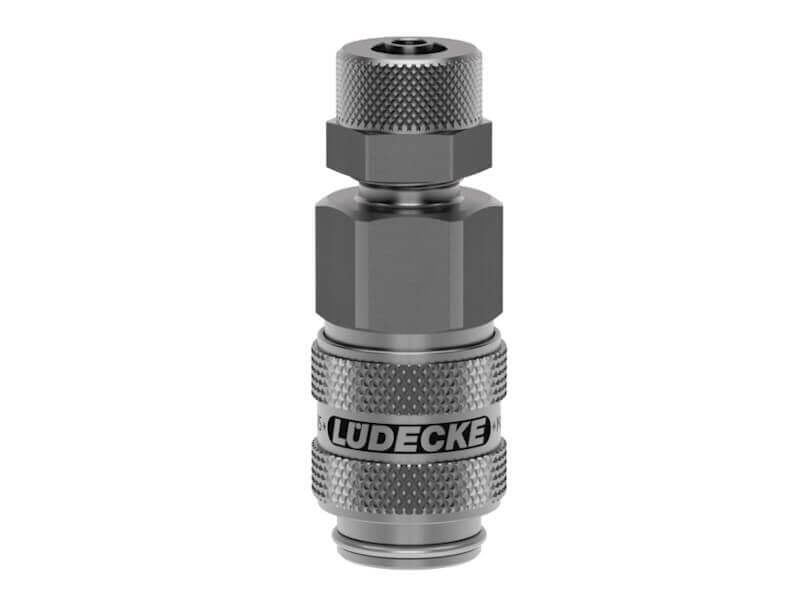 Gniazdo szybkozłącza obustronnie odcinającego z króćcem i nakrętką zaciskową, wykonane ze stali szlachetnej (nierdzewnej) i uszczelnieniem z Vitomu (FKM).