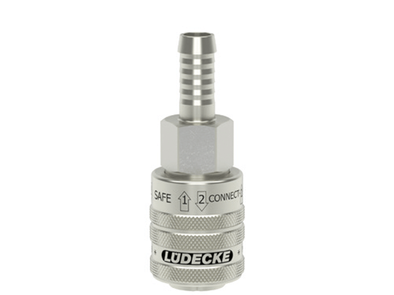 Gniazdo szybkozłączki jednostronnie odcinającej z króćcem do węża, wykonane z mosiądzu (MS 58), z elementami ze stali hartowanej, stali szlachetnej i uszczelnieniem z gumy nitrylowej (NBR).