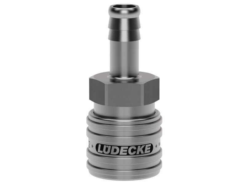 Gniazdo szybkozłącza dwustronnie odcinającego z króćcem do węża, wykonane ze stali szlachetnej (nierdzewnej) i uszczelnieniem z Vitomu (FKM).