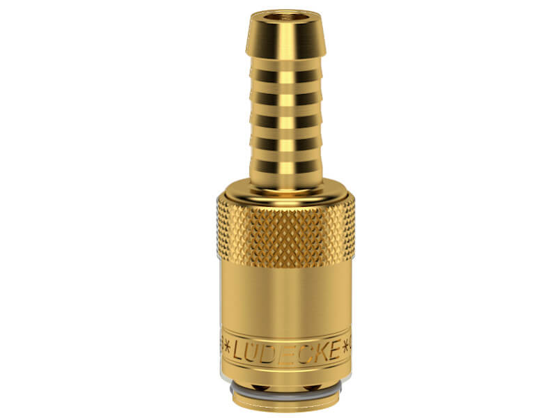 Gniazdo szybkozłączki z króćcem do węża, wykonane z mosiądzu (MS 58), z elementami ze stali szlachetnej i uszczelnieniem z gumy fluorowej (FKM).