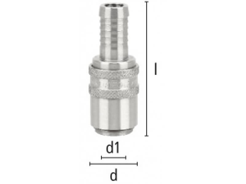 Gniazdo szybkozłączki z króćcem do węża, wykonane ze stali szlachetnej i uszczelnieniem z gumy fluorowej (FKM).