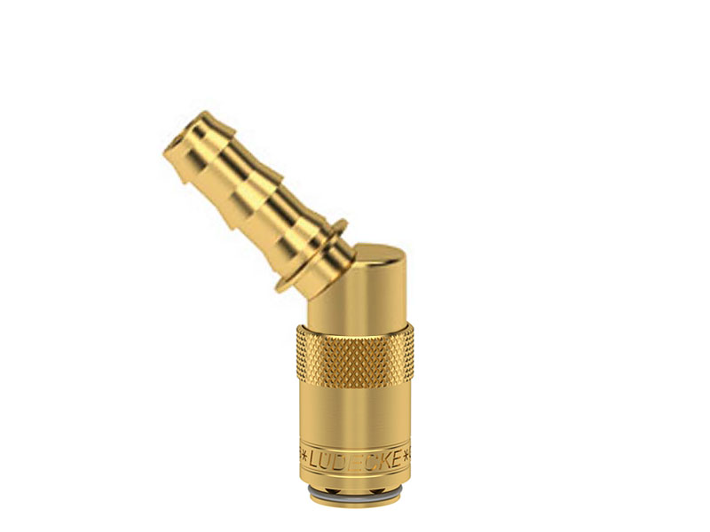 Gniazdo szybkozłączki z króćcem do węża, wykonane z mosiądzu (MS 58), z elementami ze stali szlachetnej i uszczelnieniem z gumy fluorowej (FKM).
