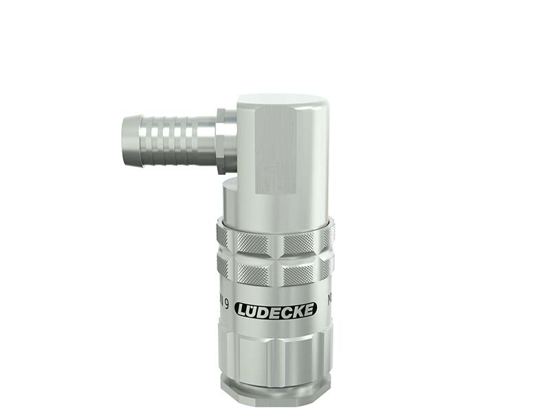 Gniazdo szybkozłączki z króćcem do węża pod kątem 90º, wykonane z mosiądzu (MS 58) niklowanego, z elementami ze stali szlachetnej i uszczelnieniem z gumy fluorowej (FKM).