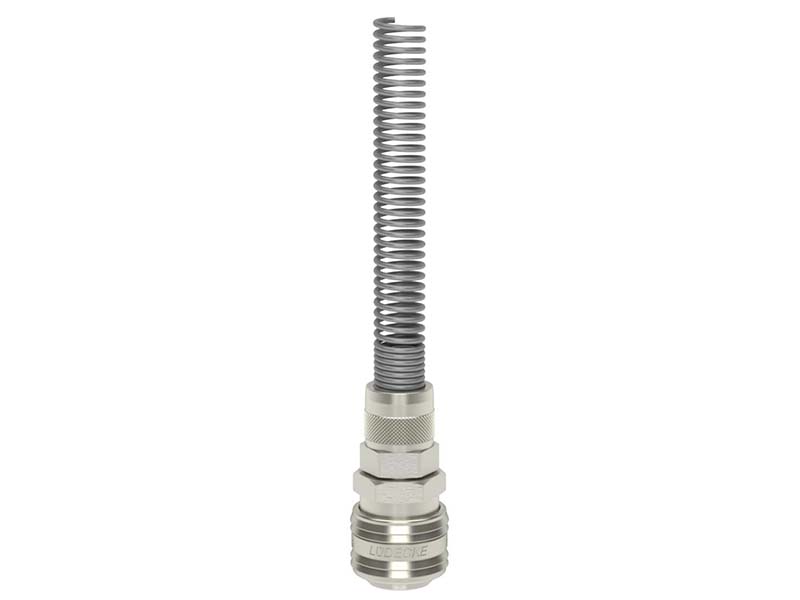 Gniazdo szybkozłącza jednostronnie odcinającego z króćcem na wąż, nakrętką zaciskową i spiralą ochronną wykonane z mosiądzu (MS 58) niklowanego, z elementami ze stali szlachetnej i uszczelnieniem z gumy nitrylowej (NBR).