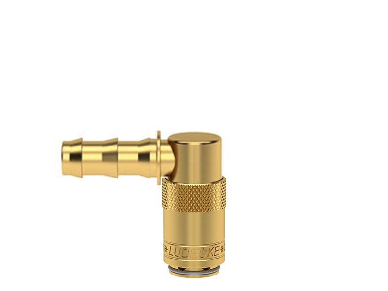 Gniazdo szybkozłączki z króćcem do węża, wykonane z mosiądzu (MS 58), z elementami ze stali szlachetnej i uszczelnieniem z gumy fluorowej (FKM).