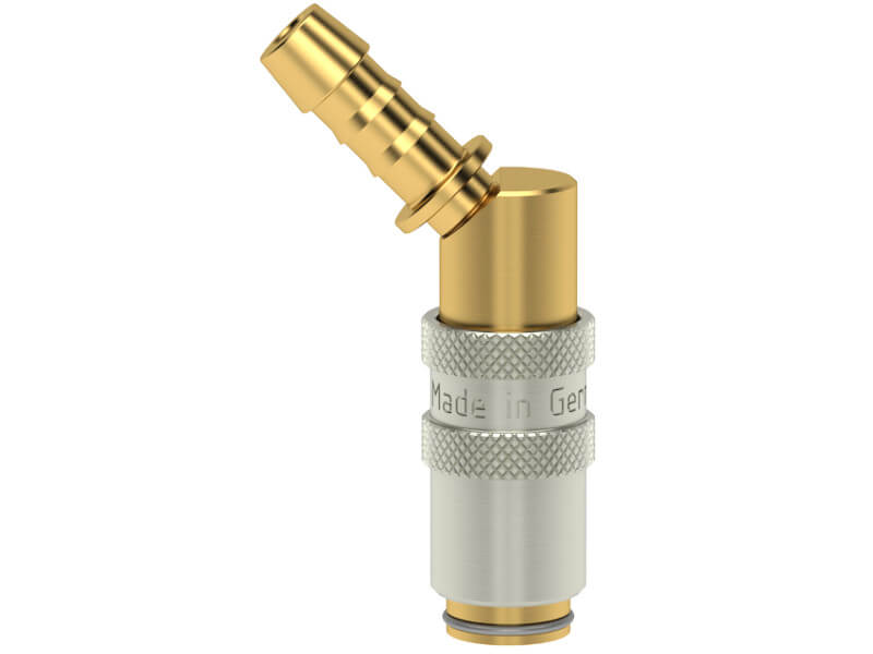 Gniazdo szybkozłączki z króćcem do węża pod kątem 45°, wykonane z mosiądzu (MS 58) niklowanego, z elementami ze stali szlachetnej i uszczelnieniem z gumy fluorowej (FKM).