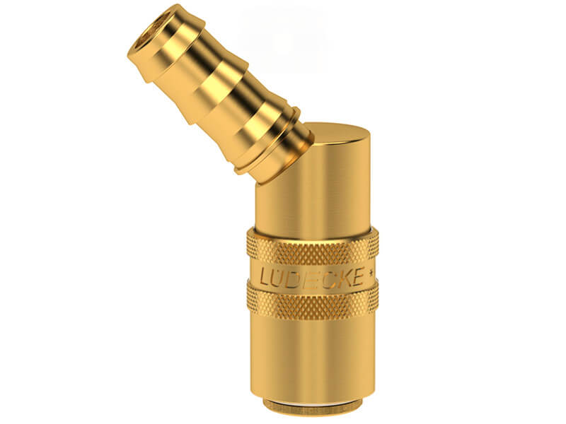 Gniazdo szybkozłączki z króćcem do węża, wykonane z mosiądzu (MS 58), z elementami ze stali szlachetnej i uszczelnieniem z gumy fluorowej (FKM).