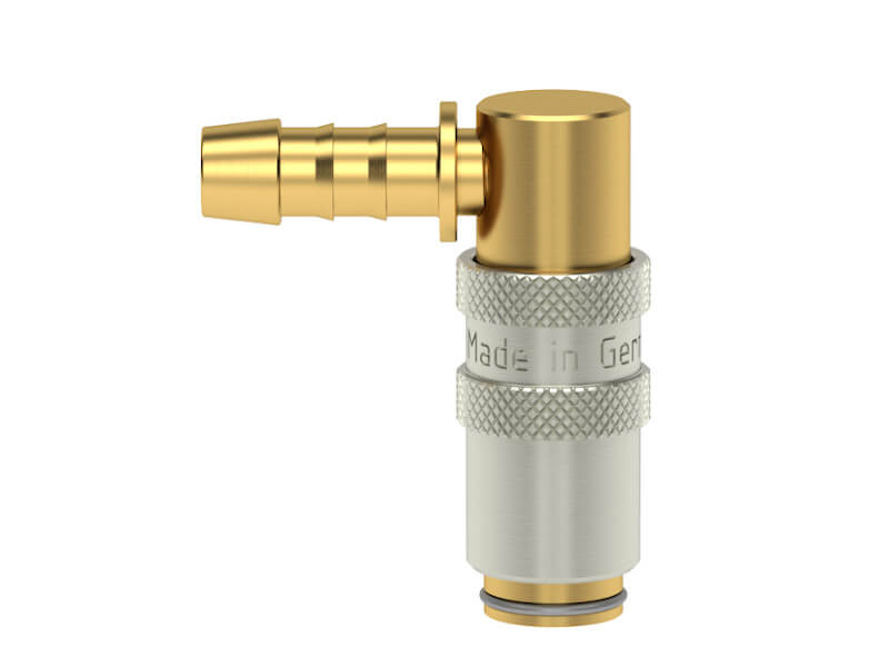 Gniazdo szybkozłączki z króćcem do węża, wykonane z mosiądzu (MS 58) niklowanego, z elementami ze stali szlachetnej i uszczelnieniem z gumy fluorowej (FKM).