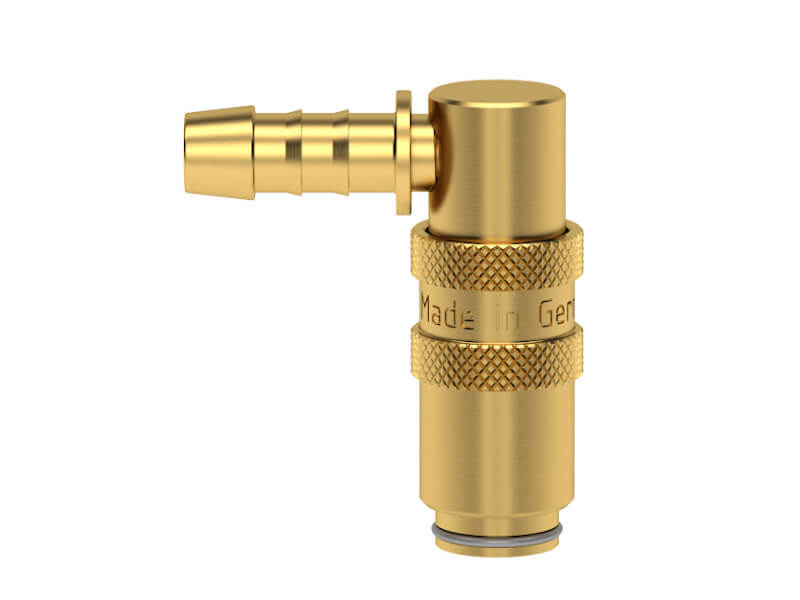 Gniazdo szybkozłączki z króćcem do węża, wykonane z mosiądzu (MS 58), z elementami ze stali szlachetnej i uszczelnieniem z gumy fluorowej (FKM).