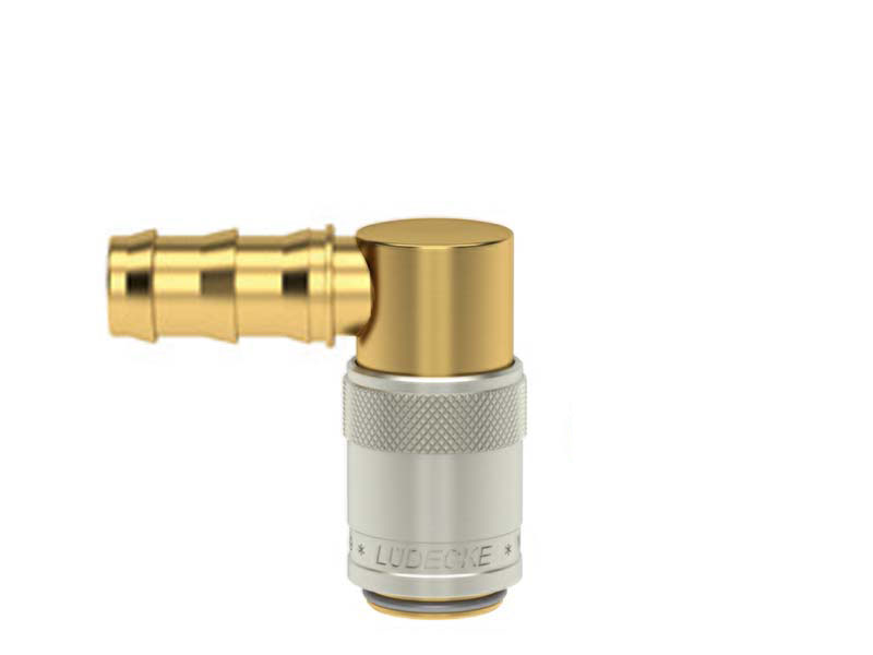 Gniazdo szybkozłączki z króćcem do węża, wykonane z mosiądzu (MS 58), z elementami ze stali szlachetnej, mosiądzu niklowanego i uszczelnieniem z gumy fluorowej (FKM).