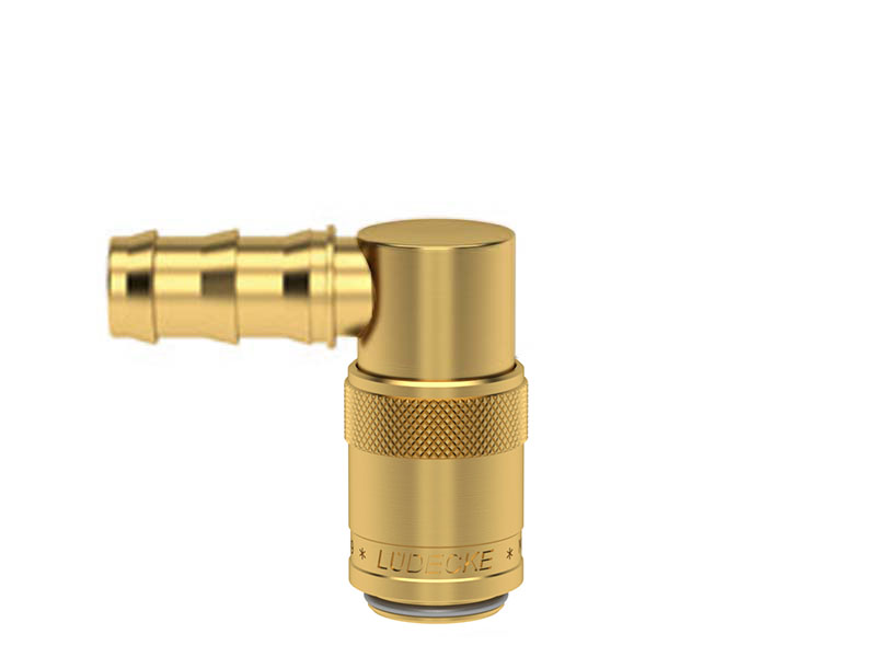 Gniazdo szybkozłączki z króćcem do węża, wykonane z mosiądzu (MS 58), z elementami ze stali szlachetnej i uszczelnieniem z gumy fluorowej (FKM).