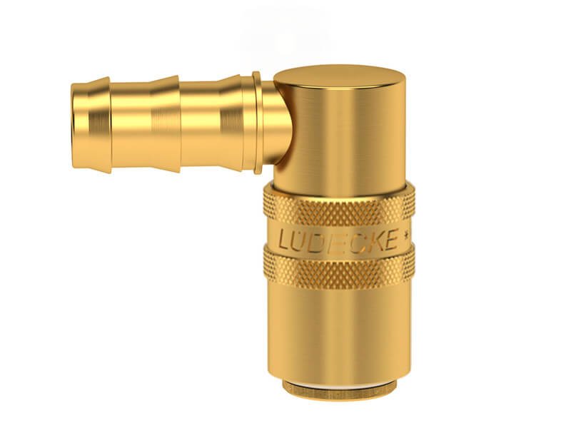 Gniazdo szybkozłączki z króćcem do węża, wykonane z mosiądzu (MS 58), z elementami ze stali szlachetnej i uszczelnieniem z gumy fluorowej (FKM).