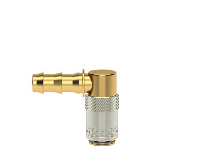 Gniazdo szybkozłączki z króćcem do węża, wykonane z mosiądzu (MS 58), z elementami ze stali szlachetnej, mosiądzu niklowanego i uszczelnieniem z gumy fluorowej (FKM).