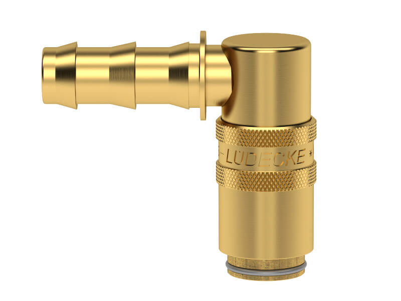 Gniazdo szybkozłączki z króćcem do węża, wykonane z mosiądzu (MS 58), z elementami ze stali szlachetnej i uszczelnieniem z gumy fluorowej (FKM).