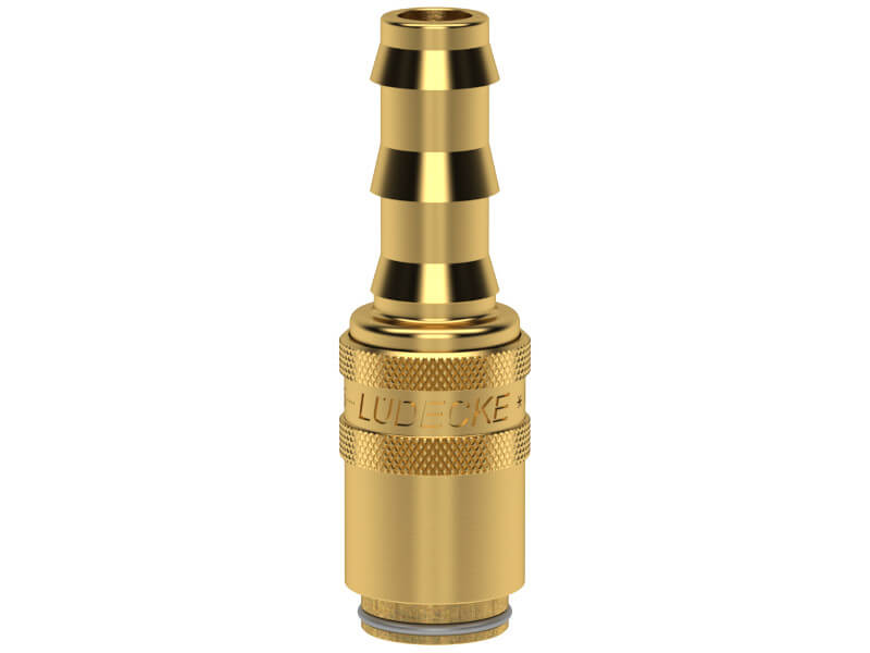 Gniazdo szybkozłączki z króćcem do węża, wykonane z mosiądzu (MS 58) , z elementami ze stali szlachetnej, i uszczelnieniem z gumy fluorowej (FKM).