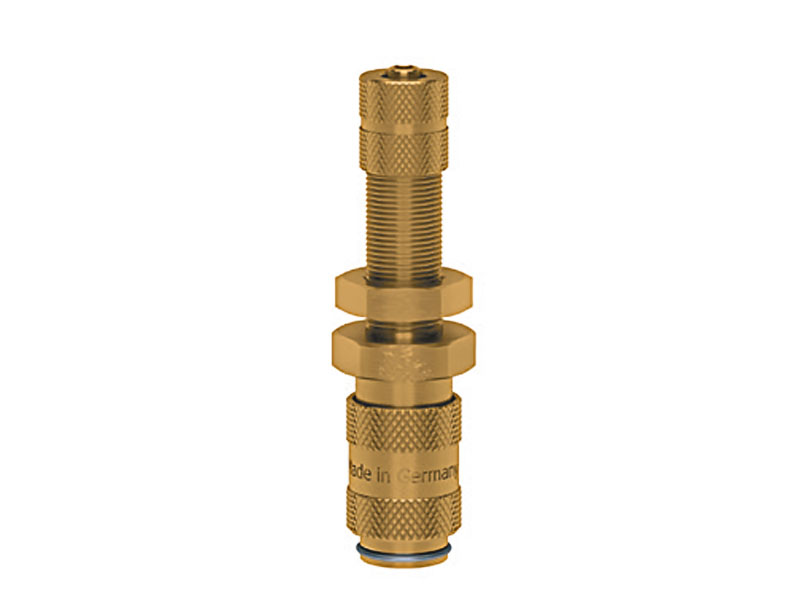 Gniazdo szybkozłączki grodziowej jednostronnie odcinającej z króćcem na wąż, nakrętką kontrującą i nakrętką zaciskową, wykonane z mosiądzu (MS 58), z elementami ze stali szlachetnej i uszczelnieniem z gumy nitrylowej (NBR).