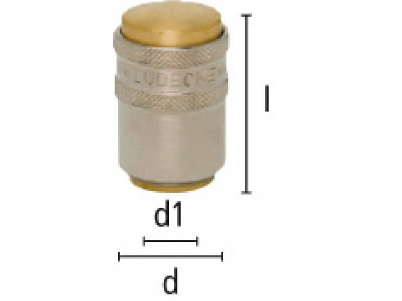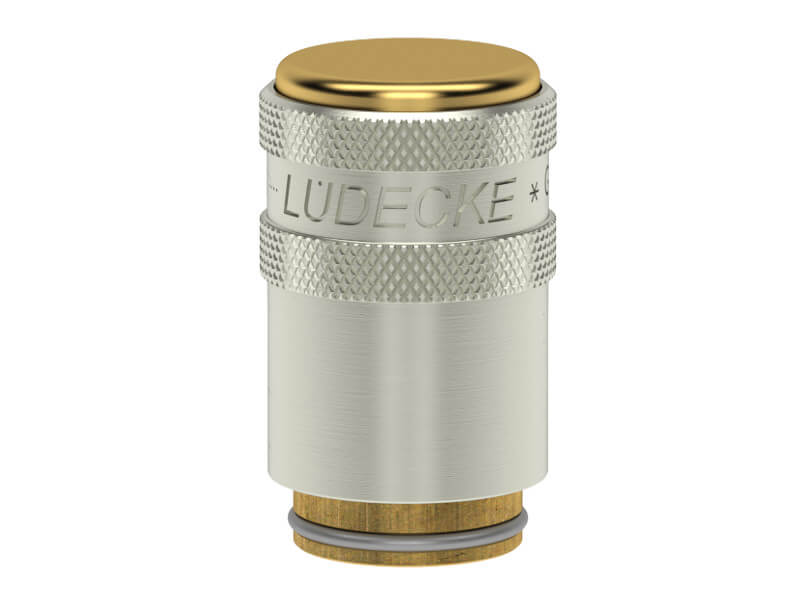 Gniazdo szybkozłączki zaślepiającej, wykonane z mosiądzu (MS 58), z elementami ze stali szlachetnej, mosiądzu niklowanego i uszczelnieniem z gumy fluorowej (FKM).