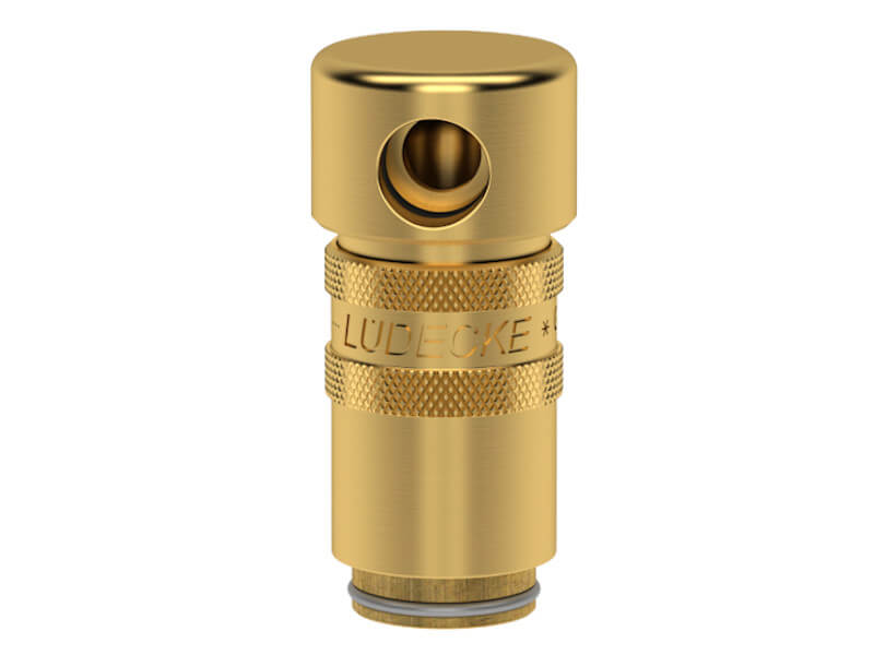 Gniazdo szybkozłączki z otworem montażowym pod kątem prostym, wykonane z mosiądzu (MS 58), z elementami ze stali szlachetnej i uszczelnieniem z gumy fluorowej (FKM).