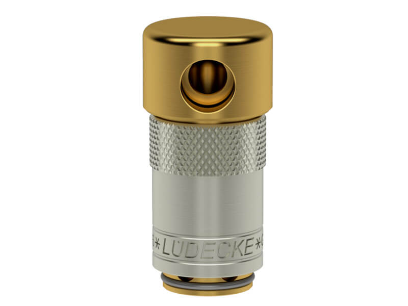 Gniazdo szybkozłączki z otworem montażowym pod kątem prostym, wykonane z mosiądzu (MS 58), z elementami ze stali szlachetnej, mosiądz niklowanego i uszczelnieniem z gumy fluorowej (FKM).
