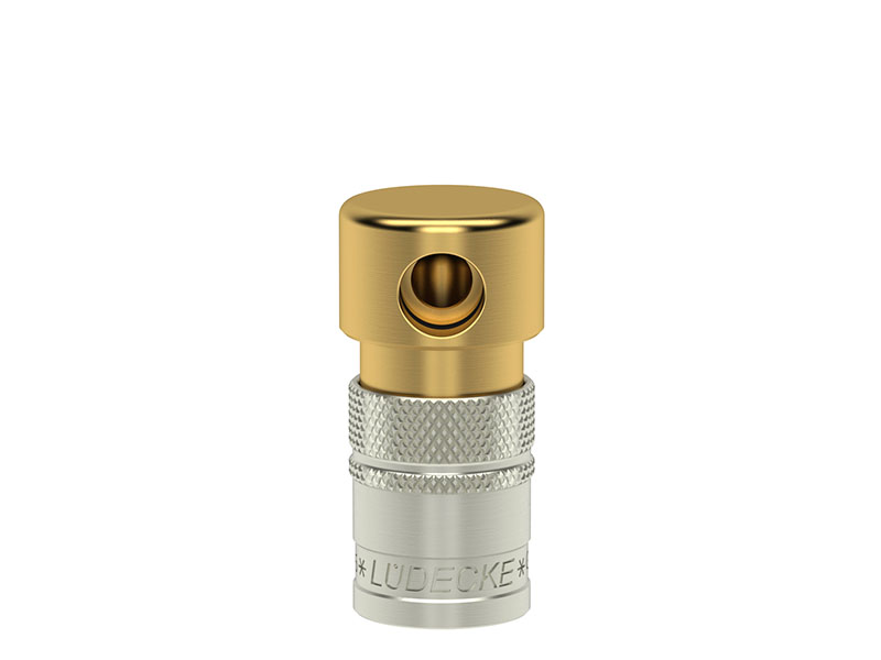 Gniazdo szybkozłączki z otworem montażowym pod kątem prostym, wykonane z mosiądzu (MS 58), z elementami ze stali szlachetnej, mosiądz niklowanego i uszczelnieniem z gumy fluorowej (FKM).