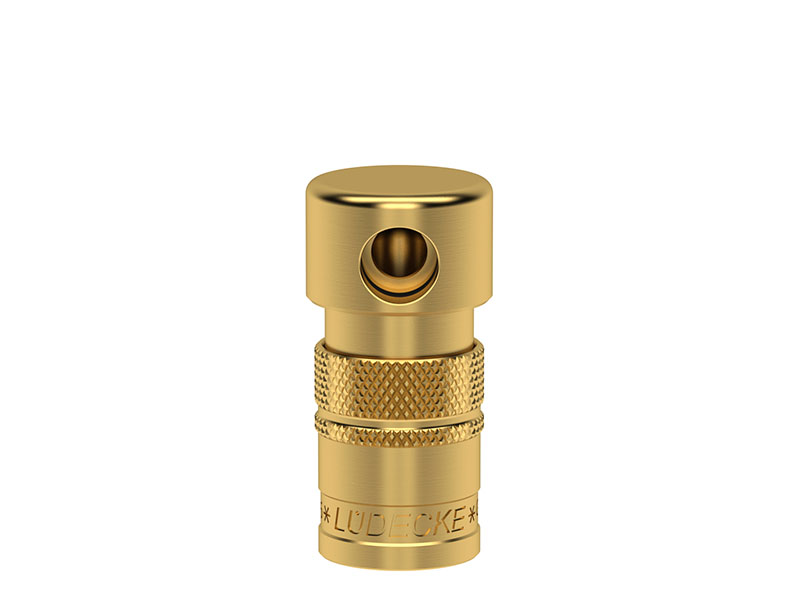 Gniazdo szybkozłączki z otworem montażowym pod kątem prostym, wykonane z mosiądzu (MS 58), z elementami ze stali szlachetnej i uszczelnieniem z gumy fluorowej (FKM).
