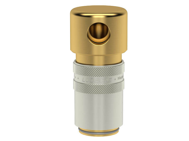 Gniazdo szybkozłączki z otworem montażowym pod kątem prostym, wykonane z mosiądzu (MS 58), z elementami ze stali szlachetnej, mosiądzu niklowanego i uszczelnieniem z gumy fluorowej (FKM).