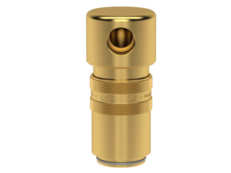 Gniazdo szybkozłączki z otworem montażowym pod kątem prostym, wykonane z mosiądzu (MS 58), z elementami ze stali szlachetnej i uszczelnieniem z gumy fluorowej (FKM).