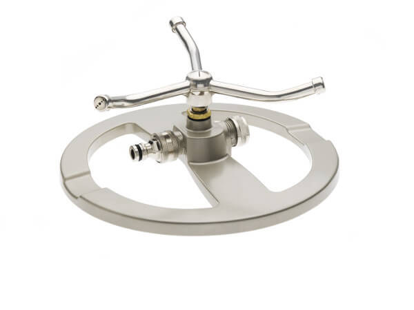 Zraszacz kołowy trójramienny wykonany z aluminium, z elementami z mosiądzu, mosiądzu chromowanego.