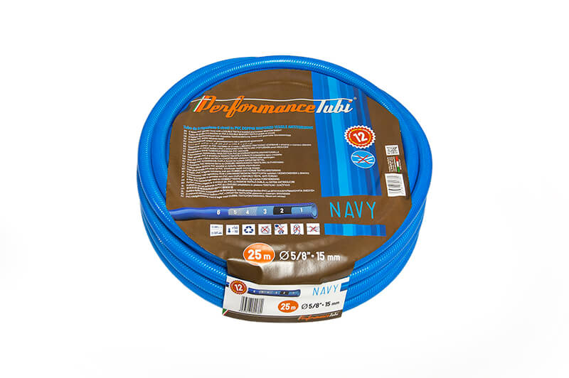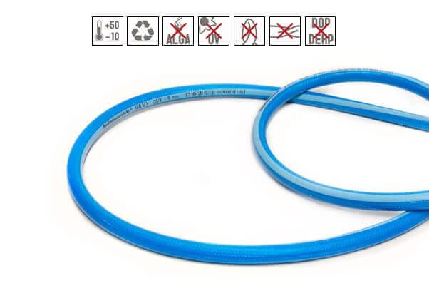 Wąż NAVY zbudowany jest z elastycznego PCV. Konstrukcja węża wzmocniona została siatką tekstylną. Wąż dla żeglarzy. Szczególnie polecany do mycia kadłubów jachtów oraz pokładów jachtów. Odpowiedni również do innych wymagających zastosowań. Zapobiega skręcaniu i załamaniu, jest odporny na mikroorganizmy oraz drobnoustroje. Warstwa zewnętrzna węża odporna jest na promieniowanie UV. NAVY to bardzo wytrzymały wąż, przystosowany do długotrwałej pracy na powietrzu. Producent daje dwunastoletnią gwarancję użyteczności produktu.