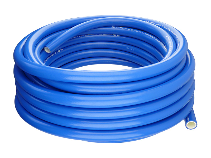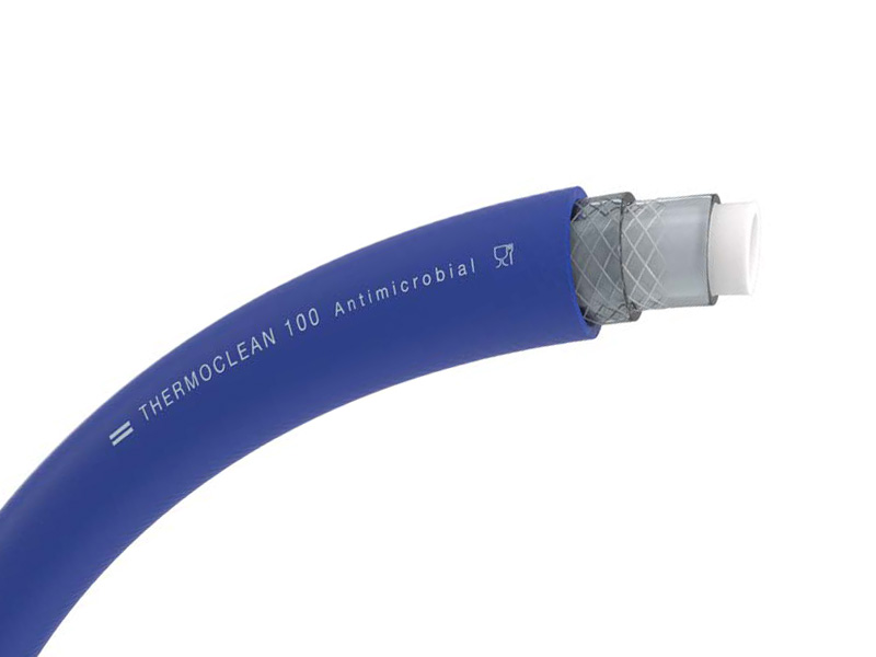 Zastosowania:Wąż THERMOCLEAN 100 ANTIMICROBIAL dedykowany jest do systemów utrzymania czystości w przemyśle spożywczym i rolnictwie. Można nim transportować gorącą wodę (do 100°C), zawierającą również środki dezynfekujące i detergenty. Wyjątkowo dobrze radzi sobie z nagłymi, krótkotrwałymi uderzeniami wyższego ciśnienia i temperatury, co jest szczególnie istotne w aplikacjach z pistoletami myjącymi. Termoizolacyjne warstwy, zapewniają większy komfort pracy, zmniejszając narażenie operatorów na oparzenia. Specjalna mieszanka zastosowanego PVC, na wewnętrznej i zewnętrznej warstwie, ogranicza rozwój drobnoustrojów, co zostało potwierdzone nawet 82% skutecznością w przypadku wirusa COVID 19. Materiały dopuszczone do kontaktu z żywnością, spełniają restrykcyjne normy dotyczące zasad utrzymania higieny w przetwórstwie spożywczym.