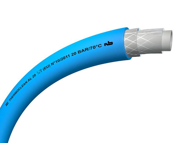 Zastosowania:Wąż THERMOCLEAN AL 20 to wysokowydajny produkt przeznaczony do przemysłowego mycia w warunkach średniego ciśnienia (40 barów przy temperaturze 70°C). Jego sześciowarstwowa konstrukcja, wzmocniona podwójnym oplotem tekstylnym z włókna poliestrowego, zapewnia wyjątkową wytrzymałość. Zewnętrzna powłoka węża jest nieplamiąca oraz odporna na tłuszcze i detergenty, co gwarantuje trwałość w wymagających warunkach w przemyśle spożywczym.