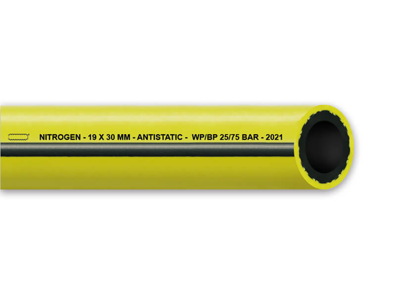 Wysokociśnieniowy wąż tłoczny NITROGEN/YELLOW, wykonany z tworzyw sztucznych (PCV), z wzmocnieniem z włókien aramidowych, ze specjalnymi, odporwadzającymi ładunki eletryczne wzdłużnymi paskami, o rezystencji R < 106 Ω, dzięki czemu może być stosowany w otoczeniu substancji łatwopalnych (ATEX). Przeznaczony do transportu azotu i sprężonego powietrza.